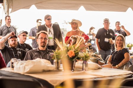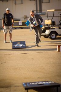 - The project’s groundbreaking celebration was another standout event, held outdoors under a cooled tent set up in the sales center parking lot. All details, including catering from the popular Captain Billy’s Whiz Bang Burgers, margarita machines, beer service, and music from a live DJ were planned. Floral arrangements in hard hats added a playful construction-themed touch, while large tractors parked around the property created a striking visual display. Guests who RSVP’d in advance received suite tickets to an upcoming Texas Rangers game as an added incentive.